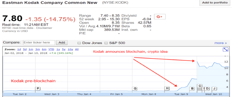 When Eastman Kodak entered the arena with its Kodak Coin its shares doubled on the news.